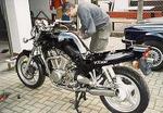 Nach Unfall Rahmenbruch. Eine zweite VX800 mit Motorplatzer aus dem Norden gekauft und den Rahmen Sandstrahlen lassen. Der Rahmen ist mit pulverbeschichtes Kunststoff lackiert.
